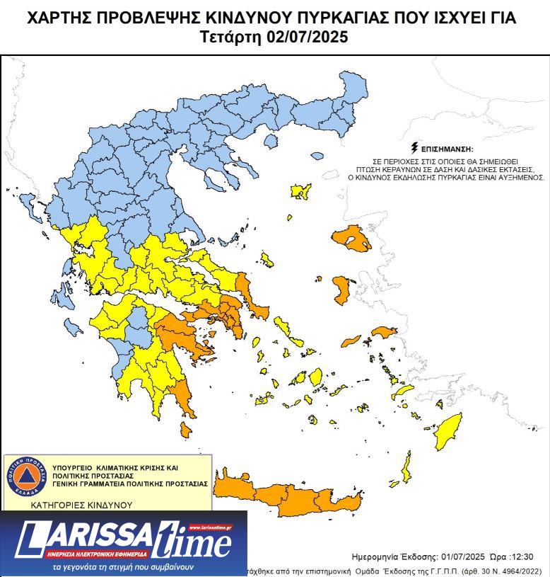Αναλυτικά, σύμφωνα με το Χάρτη Πρόβλεψης Κινδύνου Πυρκαγιάς που εκδίδει η Γενική Γραμματεία Πολιτικής Προστασίας του Υπουργείου Κλιματικής Κρίσης & Πολιτικής Προστασίας (civilprotection.gov.gr), για αύριο Τετάρτη 02 Ιουλίου 2025, προβλέπεται πολύ υψηλός κίνδυνος πυρκαγιάς (κατηγορία κινδύνου 4) για τις εξής περιοχές: