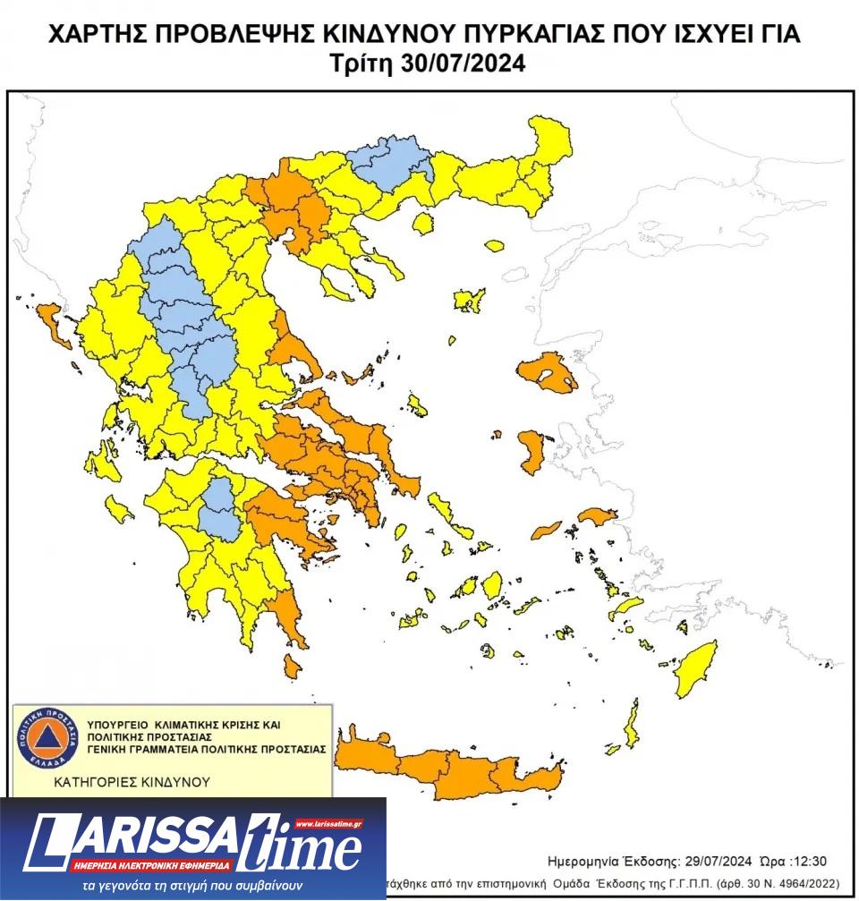 Πολύ υψηλός είναι ο κίνδυνος να εκδηλωθεί φωτιά (κατηγορία κινδύνου 4) αύριο στις περιφέρειες Αττικής και Κρήτης καθώς και σε αρκετές περιοχές της υπόλοιπης Ελλάδας, σύμφωνα με το Χάρτη Πρόβλεψης Κινδύνου Πυρκαγιάς που εκδίδει η γενική γραμματεία Πολιτικής Προστασίας του υπουργείου Κλιματικής Κρίσης και Πολιτικής Προστασίας .