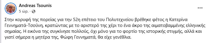 «Στην κορυφή της πορείας για την 52η επέτειο του Πολυτεχνείου βρέθηκε φέτος η Κατερίνα Γεννηματά-Τσούνη, κρατώντας με το αριστερό της χέρι το ένα άκρο της αιματοβαμμένης ελληνικής σημαίας. Η εικόνα της συγκίνησε πολλούς, όχι μόνο για το φορτίο της ιστορικής στιγμής, αλλά και γιατί σήμερα η μητέρα της, Φώφη Γεννηματά, θα είχε γενέθλια», έγραψε στα social media ο σύζυγος της αείμνηστης προέδρου του ΠΑΣΟΚ, και πατέρας της Κατερίνας, Ανδρέας Τσούνης.