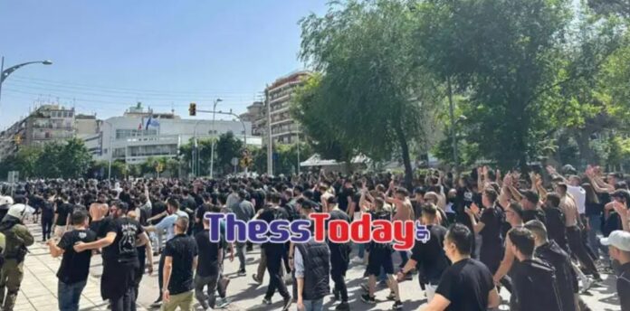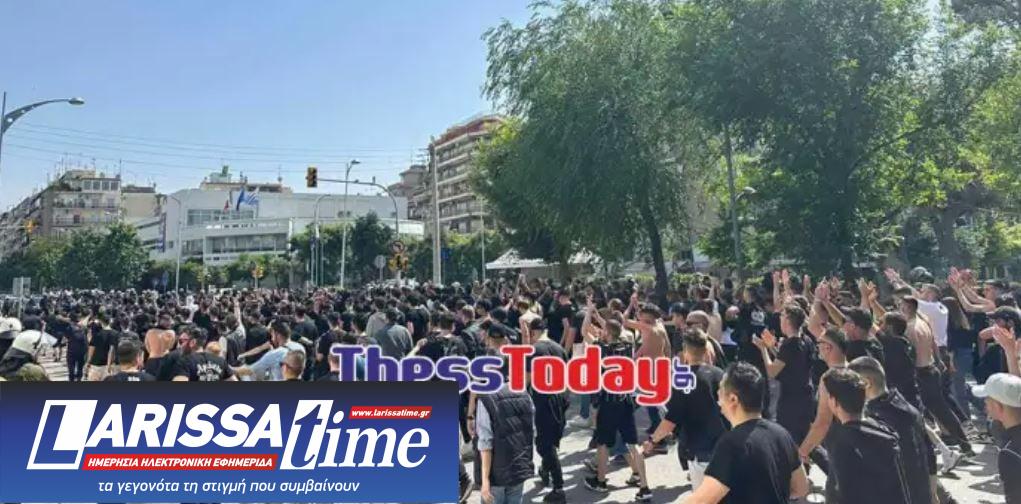 Πορεία στη Θεσσαλονίκη πραγματοποιούν οι οπαδοί του ΠΑΟΚ, πριν από το ντέρμπι με τον Άρη στο «Κλεάνθης Βικελίδης», που θα κρίνει τον πρωταθλητή.