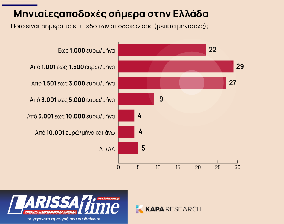 Όσον αφορά τις μηνιαίες αποδοχές στην Ελλάδα (μεικτά μηνιαίως), το 44% λαμβάνει αποδοχές άνω των 1.500 ευρώ (το 27% από 1.501 έως 3.000 ευρώ, το 17% από 3.001 ευρώ και άνω).
