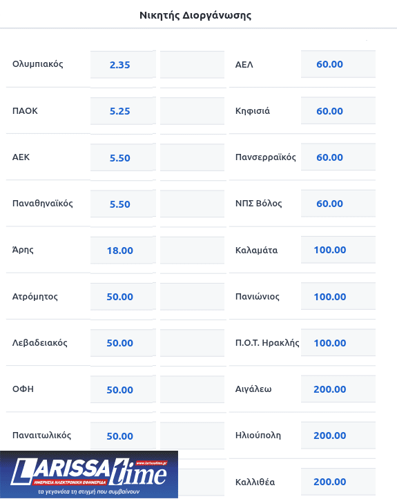 Το aelole.gr συγκέντρωσε και σας παραθέτει στοιχηματικές αποδόσεις για το νικητή της διοργάνωσης του Κυπέλλου Ελλάδας τη σεζόν 2025-2026. Ο Ολυμπιακός είναι σύμφωνα με τις αποδόσεις που έβγαλαν στοιχηματικές εταιρίες για το διαδικτυακό «Πάμε Στοίχημα» το πρώτο φαβορί για την κατάκτηση του Κυπέλλου Ελλάδος, με απόδοση που έχει οριστεί στο 2.35, ακολουθεί o ΠΑΟΚ με 5.25, η ΑΕΚ με το Παναθηναϊκός έχουν 5.50, ο Άρης με 18, ενώ στην 11η θέση για να “σηκώσει” το Κύπελλο, βρίσκεται η ΑΕΛ μαζί με άλλες τρεις ομάδες της Superleague, με την απόδοσή να είναι στο 60. Δείτε αναλυτικά παρακάτω όλες τις αποδόσεις.