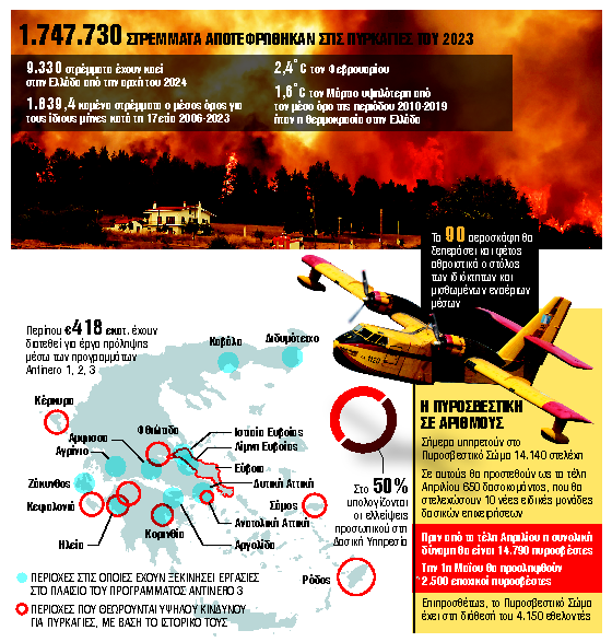 Βαριά τη σκιά της στο επερχόμενο καλοκαίρι ρίχνει η καταστροφική αντιπυρική περίοδος του 2023, χρονιά κατά την οποία αποτεφρώθηκαν συνολικά 1.747.730 στρέμματα γης και έχασαν τη ζωή τους τουλάχιστον 25 άνθρωποι.