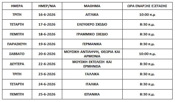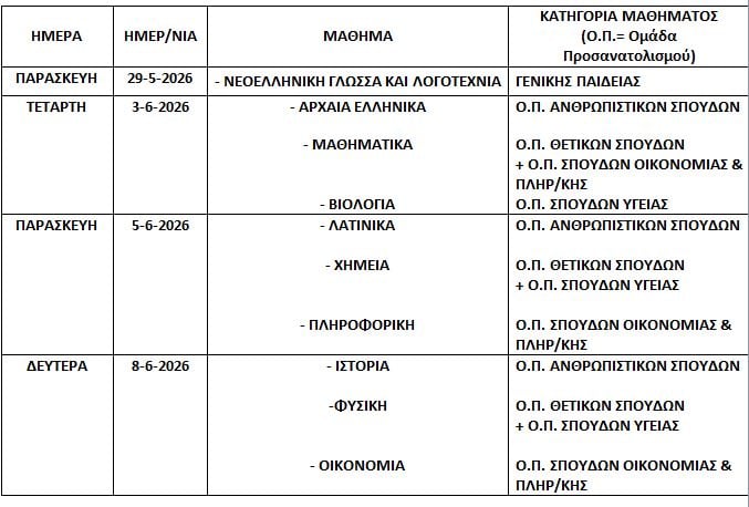 Στα λύκεια, τα μαθήματα ολοκληρώνονται την Παρασκευή 15 Μαΐου 2026, ενώ το πρόγραμμα των εξετάσεων ανακοινώνεται στους μαθητές τουλάχιστον πέντε ημέρες πριν.