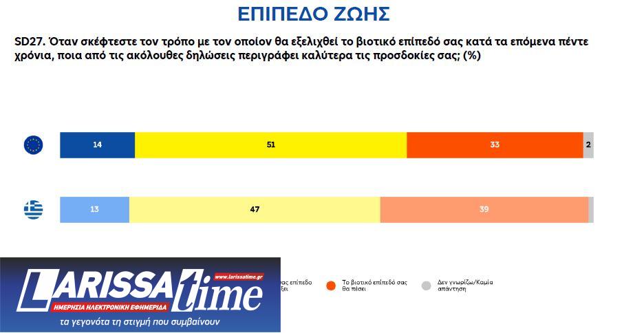 Οι Έλληνες εμφανίζονται επίσης ελαφρώς πιο απαισιόδοξοι, σε σχέση με το μέσο όρο των Ευρωπαίων, για την εξέλιξη του βιοτικού τους επιπέδου. Μόνο το 13% δηλώνουν ότι θα βελτιωθεί ενώ το 39% λένε ότι θα πέσει.