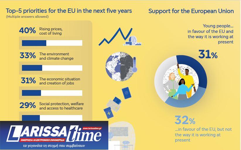 Πρόσφατη έρευνα του Ευρωπαϊκού Κοινοβουλίου, σε πολίτες της ΕΕ ηλικίας 16-30 ετών, δείχνει ότι η άνοδος των τιμών και το κόστος ζωής απασχολεί την πλειοψηφία. Το ένα τρίτο των ερωτηθέντων δήλωσε ότι πιστεύει ότι η ΕΕ θα πρέπει να εστιάσει την προσοχή της στο περιβάλλον και την κλιματική αλλαγή κατά την επόμενη πενταετία, ενώ το 31% πιστεύει ότι η οικονομική κατάσταση και η δημιουργία θέσεων εργασίας θα πρέπει να αποτελέσουν προτεραιότητα.