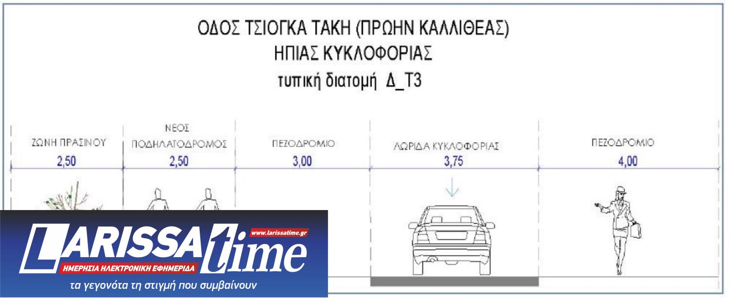 Παράλληλα, ενισχύεται το δίκτυο ποδηλατικών διαδρομών, με τη χωροθέτησή τους τόσο επί της οδού Τ. Τσιόγκα, όσο και επί της οδού Κραννώνος, ενώ ισχυροποιείται το πλέγμα ήπιας κυκλοφορίας, με παρεμβάσεις σε τμήματα οδών (Κουτλιμπανά, Ποσειδώνος) προς το ποτάμι.