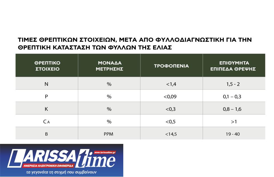 Για την καλλιέργεια της ελιάς, η διαφυλλική λίπανση µετά τη συγκοµιδή αυξάνει τις συγκεντρώσεις ορισµένων θρεπτικών στοιχείων και ειδικότερα κάποιων ιχνοστοιχείων εντός των δένδρων. Αυτό µπορεί να επηρεάσει θετικά τη διαφοροποίηση των οφθαλµών, ώστε να επιτύχουµε µια πλούσια ανθοφορία που είναι η βάση για µια µεγάλη παραγωγή. Μάλιστα, έχοντας ως στόχο τη σταθεροποίηση των ετήσιων αποδόσεων, προϋπόθεση για να αποδίδει το πλάνο θρέψης αποτελεί η πραγµατοποίηση εδαφολογικής ανάλυσης και φυλλοδιαγνωστικής στον κατάλληλο χρόνο, σίγουρα µέσα στο χειµώνα και µετά το πέρας του στρες συγκοµιδής.