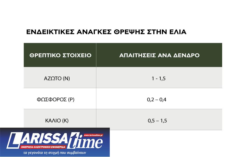 Η ελιά, ανθεκτική από την φύση της, συχνά δηµιουργεί την λανθασµένη εντύπωση χαµηλών απαιτήσεων θρέψης. Υψηλές αποδόσεις όµως, και καρποφορία κάθε χρόνο έρχονται µόνο µετά από επαρκή λίπανση. ∆έντρα εξουθενωµένα, έπειτα από ιδιαίτερα παραγωγικές χρονιές, εάν τραφούν σωστά, αµέσως µετά τη συγκοµιδή, αναζωογονούνται και έτσι µπαίνουν πολύ πιο έτοιµα στο ξεκίνηµα της επόµενης καλλιεργητικής περιόδου, θέτοντας τις βάσεις για βελτίωση των αποδόσεων και για τον περιορισµό της επίδρασης του φαινοµένου της παρενιαυτοφορίας. Η ανάγκη στήριξης των δέντρων καθίσταται ακόµη πιο επιτακτική, λόγω της κλιµατικής αλλαγής, καθώς, όπως φαίνεται πλέον, οι επιπτώσεις της µπορεί να είναι ιδιαίτερα επώδυνες, για όσους παραγωγούς αφήνουν τα δέντρα τους «ανοχύρωτα», σε ολοένα και πιο συχνές στρεσογόνες (ξηρασία, παγετοί, βροχές) κλιµατικές συνθήκες.