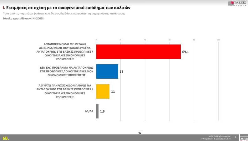 Το κόστος ζωής είναι το υπ’ αριθμόν ένα πρόβλημα με διαφορά. Οκτώ στους δέκα πολίτες δηλώνουν ότι αντιμετωπίζουν «Πολύ μεγάλη» ή «Μεγάλη δυσκολία» στο να ανταποκριθούν στις οικονομικές τους υποχρεώσεις, ενώ μόνο δύο στους δέκα δηλώνουν ότι δεν έχουν κάποιο πρόβλημα.