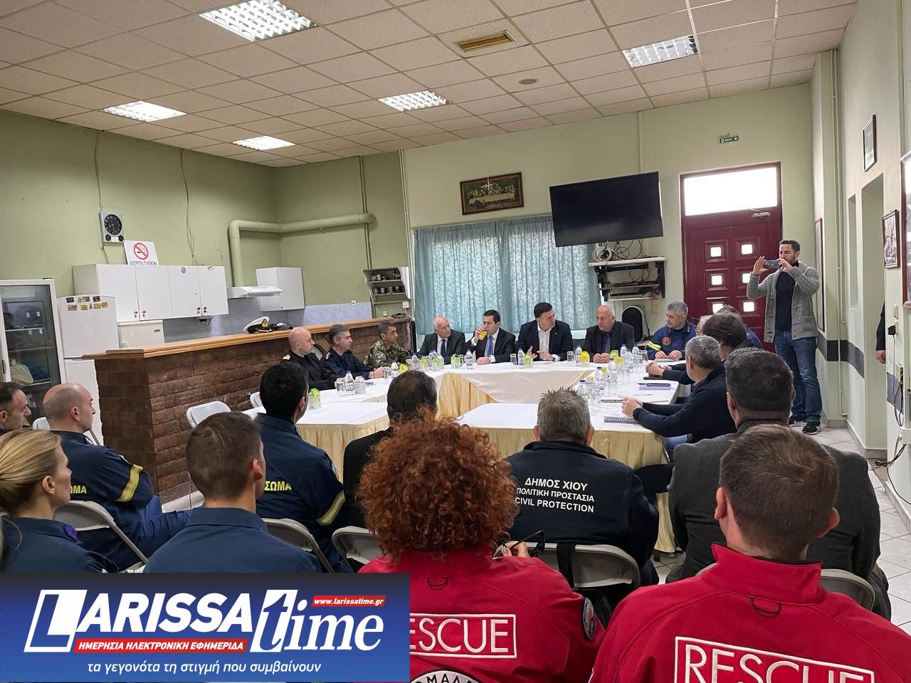 Στη σύσκεψη μετείχαν ο διοικητής ΠΕ.ΠΥ.Δ. Βορείου Αιγαίου, αρχιπύραρχος Παναγιώτης Κυπριωτέλλης, ο διοικητής Π.Υ. Ν. Χίου, πύραρχος Σταύρος Καπελλαρίδης, ο υποδιοικητής Π.Υ. Χίου, επιπυραγός Απόστολος Ντίλης, ο αστυνομικός διευθυντής Χίου, Ιωάννης Αραμπατζής, ο διοικητής 96 ΑΔΤΕ Χίου, ταξίαρχος Χαράλαμπος Αμπατζίδης, ο δήμαρχος Χίου, Ιωάννης Μαλάφης, ο διοικητής Λιμεναρχείου Χίου, αντιπλοίαρχος Παντελής Βατούσης, o αντιπεριφερειάρχης Χίου, Παντελής Βρουλής, η διευθύντρια Δασών Χίου, Θωμαΐς Κοιλούκου, ο προϊστάμενος Πολιτικής Προστασίας δήμου Χίου, Νικόλαος Βορριάς, ο εντεταλμένος σύμβουλος Πολιτικής Προστασίας Δήμου Χίου, Γεώργιος Ζώας, ο διευθυντής ΔΕΔΔΗΕ, Γεώργιος Καλαμάκης.