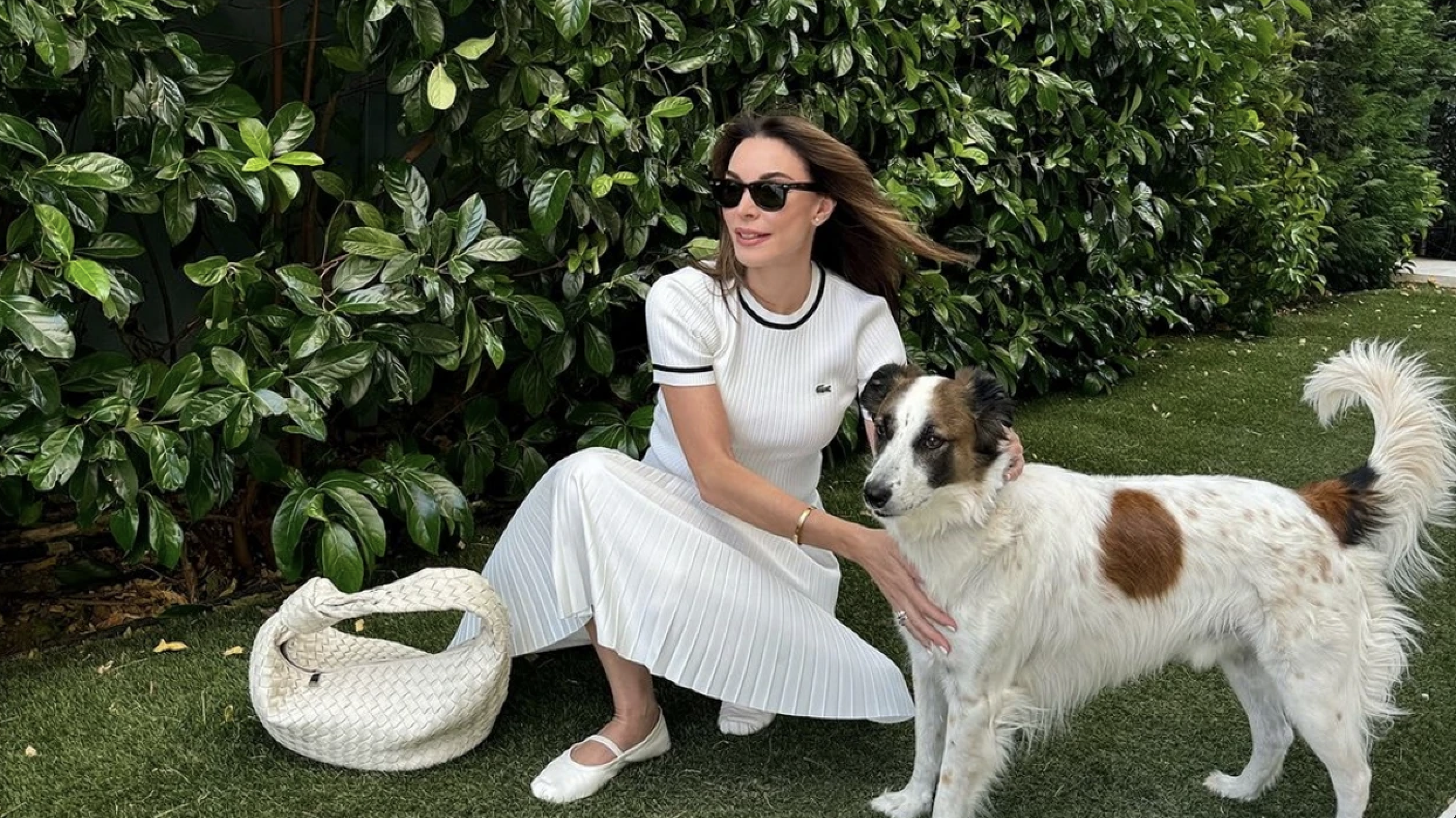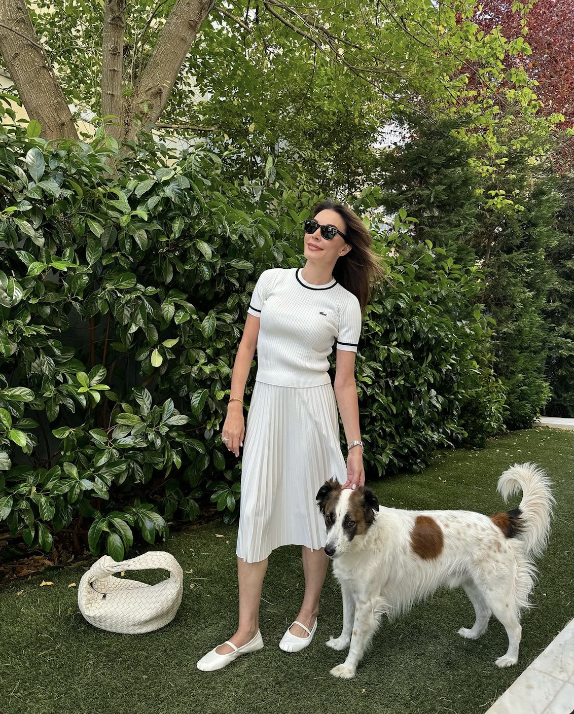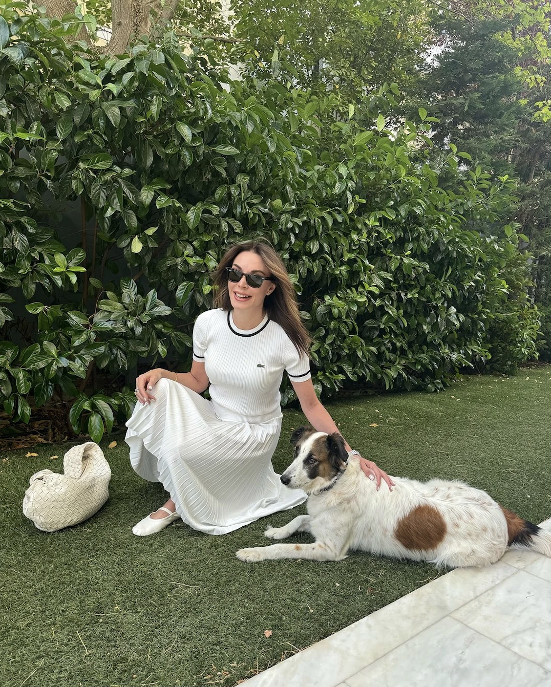 Η παρουσιάστρια της εκπομπής Τ Live του Alpha ποζάρει στον περιποιημένο κήπο της με τον αγαπημένο της σκύλο. Για την εμφάνισή της, επέλεξε ένα λευκό σύνολο εμπνευσμένο από το τένις.