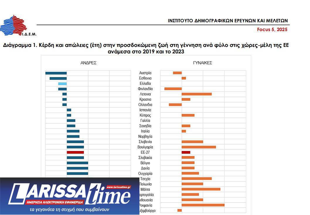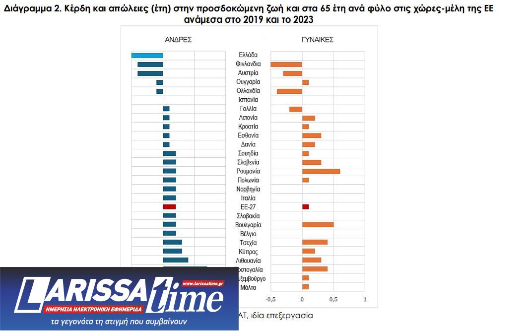 Όσον αφορά το προσδόκιμο ζωής στη γέννηση στους άνδρες και στις γυναίκες, το 2023 ο μέσος όρος στην ΕΕ-26 είναι αυξημένος κατά 0,4 και 0,2 έτη αντίστοιχα σε σχέση με το 2019 (δεν διατίθενται δεδομένα για το 2023 από την EUROSTAT για την Γερμανία).