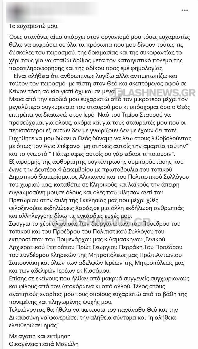 Ο παπα Μανώλης μετά τη συγκέντρωση συμπαράστασης που πραγματοποιήθηκε προς το πρόσωπό του από πιστούς, σε εκκλησία του Αλικιανού, έκανε μια ανάρτηση στην οποία εκφράζει στους διοργανωτές τους οποίους αναφέρει ονομαστικά και σε όλους τους ενορίτες, άπειρη ευγνωμοσύνη «από τα βάθη της πονεμένης και πληγωμένης μου ψυχής» όπως γράφει.