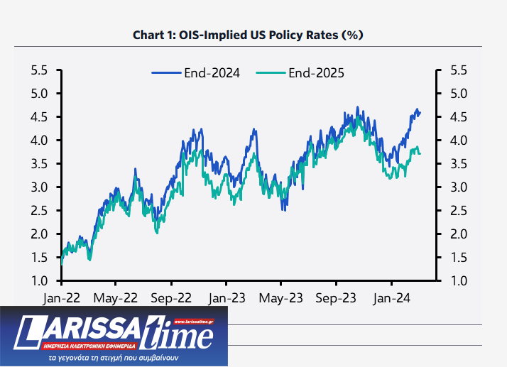 Ένα κεντρικό θέμα του 2024 μέχρι στιγμής ήταν οι προσδοκίες για μειώσεις των επιτοκίων της Fed, επιβεβαιώνει η Capital Economics. Πράγματι, το επιτόκιο πολιτικής των ΗΠΑ που εκτιμάται από την αγορά για το τέλος του 2024 είναι στα υψηλά που έφθασαν στα τέλη του περασμένου έτους. Ορισμένες εκτιμήσεις για περικοπές απλώς έχουν υποχωρήσει, αλλά η αύξηση του τεκμαρτού επιτοκίου για το τέλος του 2025 δείχνει ότι ορισμένες περικοπές έχουν αφαιρεθεί εντελώς από το τραπέζι.