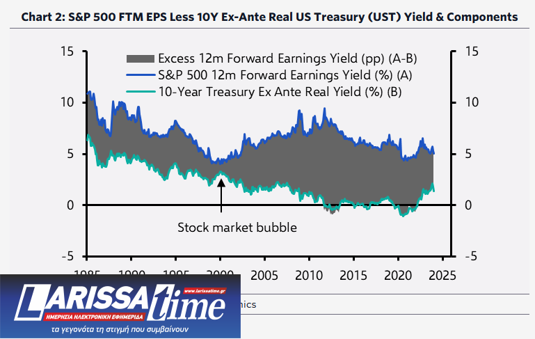 Όπως αναφέρει, δεν πιστεύει ότι οι μειώσεις των επιτοκίων της Fed είναι απαραίτητη προϋπόθεση για να διογκωθεί περαιτέρω η φούσκα των αγορών. Σε τελική ανάλυση, οι περισσότερες μετρήσεις του ασφάλιστρου κινδύνου μετοχικού κεφαλαίου έχουν περιθώριο πτώσης καθώς αυξάνεται η προβολή γύρω από την τεχνητή νοημοσύνη.