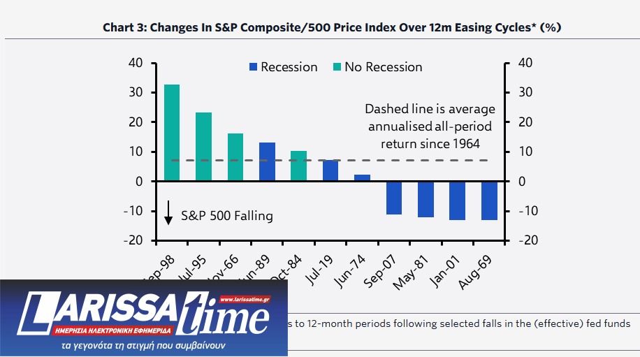 Αντί απλώς μειώσεις επιτοκίων, πολλά φαίνεται να εξαρτώνται από το οικονομικό πλαίσιο κατά τη διάρκεια του κύκλου χαλάρωσης (σε αυτή την περίπτωση, ύφεση ή καμία ύφεση).