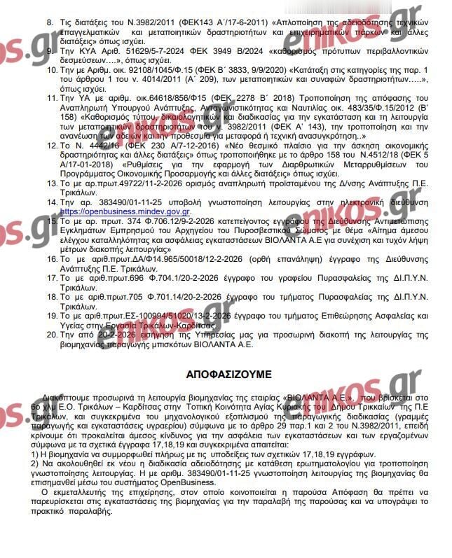 «Διακόπτουμε προσωρινά τη λειτουργία βιομηχανίας της εταιρίας «ΒΙΟΛΑΝΤΑ Α.Ε.», που βρίσκεται στο 6ο χλμ Ε.Ο. Τρικάλων – Καρδίτσας στην Τοπική Κοινότητα Αγίας Κυριακής του Δήμου Τρικκαίων της Π.Ε Τρικάλων, και συγκεκριμένα του μηχανολογικού εξοπλισμού της παραγωγικής διαδικασίας (γραμμές παραγωγής και εγκαταστάσεις υγραερίου) σύμφωνα με το άρθρο 29 παρ.1 και 2 του Ν.3982/2011, επειδή κρίνουμε ότι προκαλείται άμεσος κίνδυνος για την ασφάλεια των εγκαταστάσεων και των εργαζομένων» αναφέρεται, μεταξύ άλλων, στην απόφαση.