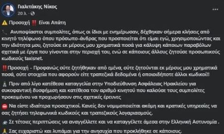 Απατεώνας χρησιμοποιεί το όνομα γνωστού αντιδημάρχου του Ηρακλείου, με στόχο να εξαπατήσει πολίτες και να τους αποσπάσει χρηματικά ποσά και προσωπικούς κωδικούς.