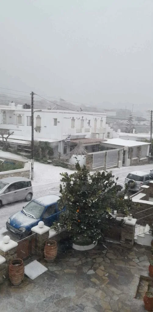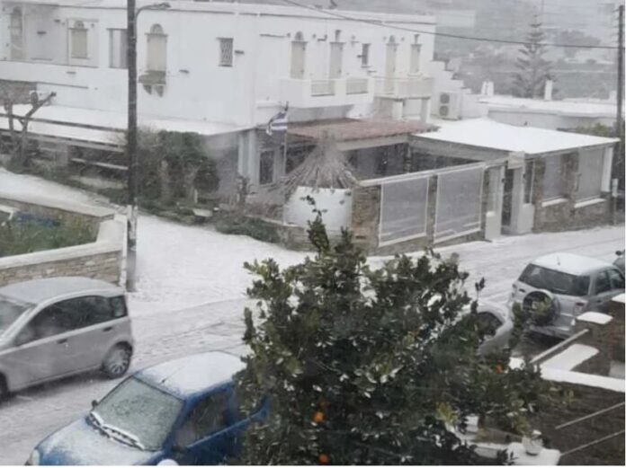 Στα χαμηλότερα υψόμετρα όπως και στην πόλη της Τήνου τα φαινόμενα εκδηλώνονται κυρίως ως χιονόνερο. Από αύριο αναμένεται σταδιακή βελτίωση του καιρού και περιορισμός των φαινομένων.