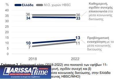 Σε σχέση με την προηγούμενη έρευνα του 2018, παρουσιάζεται αύξηση στα ποσοστά προβληματικής ενασχόλησης με τα μέσα κοινωνικής δικτύωσης στους εφήβους διεθνώς, από 7% το 2018 σε 11% το 2022. Στην Ελλάδα τα ποσοστά είναι ακόμα υψηλότερα, με έναν στους οκτώ εφήβους 11-15 ετών (13%) να θεωρείται βάσει ειδικής κλίμακας ότι κάνει προβληματική χρήση των μέσων κοινωνικής δικτύωσης.