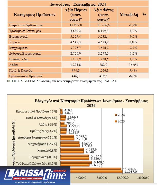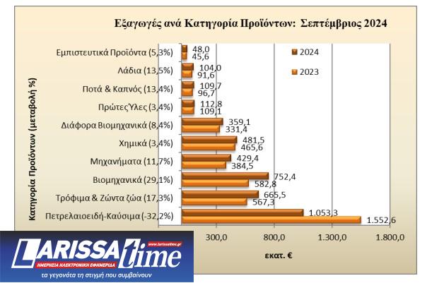 Σχετικά με τις μεγάλες κατηγορίες προϊόντων, τον Σεπτέμβριο του 2024 καταγράφονται αυξητικές τάσεις σε όλους τους κλάδους, με μοναδική εξαίρεση τον κλάδο των Πετρελαιοειδών-Καυσίμων (-32,2%).