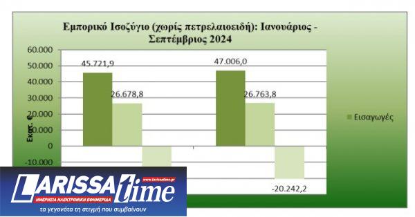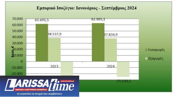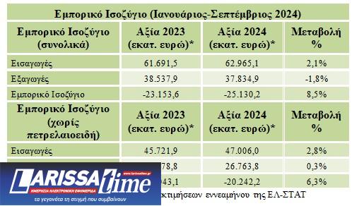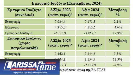 Το εμπορικό έλλειμμα στο διάστημα Ιανουαρίου-Σεπτεμβρίου του 2024 αυξήθηκε κατά 1,98 δισ. ευρώ ή κατά 8,5%