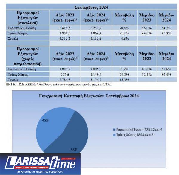 Υποχώρησαν οι εξαγωγές τον μήνα Σεπτέμβριο κατά 199 εκατ. ευρώ και κατήλθαν σε 4,12 δισ. ευρώ έναντι 4,32 δισ. ευρώ κατά τον ίδιο μήνα του έτους 2023, σύμφωνα με την ανάλυση του Πανελληνίου Συνδέσμου Εξαγωγέων (ΠΣΕ) και του Κέντρου Εξαγωγικών Ερευνών και Μελετών (ΚΕΕΜ), επί των προσωρινών στοιχείων της ΕΛ-ΣΤΑΤ.