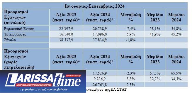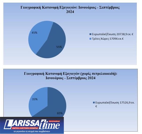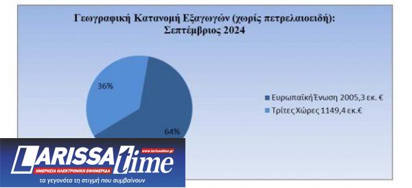Όσον αφορά στην πορεία των εξαγωγών ανά γεωγραφικές περιοχές τον Σεπτέμβριο του 2024, παρατηρείται πτώση των αποστολών προς τις χώρες της Ε.Ε. (-6,8%) όπως και προς τις Τρίτες Χώρες (-1,9%). Όταν, όμως, εξαιρεθούν τα πετρελαιοειδή η εικόνα αλλάζει εντελώς, οι εξαγωγές προς τις χώρες της ΕΕ καταγράφουν άνοδο (6,5%), ενώ οι εξαγωγές προς τις Τρίτες Χώρες, διευρύνονται σημαντικά (27,3%), σε σχέση με τον αντίστοιχο περσινό μήνα.