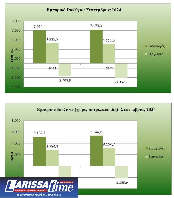 Ως αποτέλεσμα των παραπάνω, το εμπορικό έλλειμμα στο διάστημα Ιανουαρίου-Σεπτεμβρίου του 2024 αυξήθηκε κατά 1,98 δις. ευρώ ή κατά 8,5%, στα 25,13 δισ. ευρώ από 23,15 δισ. ευρώ το εννεάμηνο του 2023. Χωρίς τα πετρελαιοειδή, το εμπορικό έλλειμμα αυξήθηκε με μικρότερο ρυθμό και άγγιξε τα 20,24 δισ. ευρώ από 19,04 δισ. ευρώ, δηλαδή διογκώθηκε κατά 1,20 δισ. ευρώ ή κατά 6,3%.