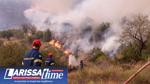 Για την κατάσβεσή της επιχειρούν 40 πυροσβέστες με 2 ομάδες πεζοπόρου, 11 οχήματα, 1 ελικόπτερο και εθελοντές. Συνδρομή από υδροφόρες και μηχανήματα έργου ΟΤΑ.