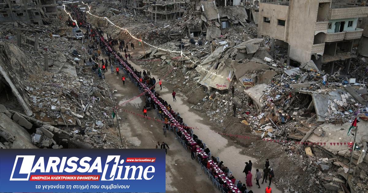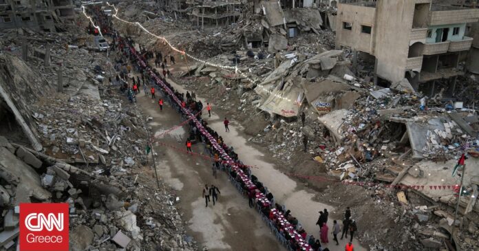 Συγκλονιστικές είναι οι φωτογραφίες από το μεγάλο τραπέζι που έστησαν ανάμεσα στα συντρίμμια οι Παλαιστίνιοι για το ιφτάρ, το νηστίσιμο γεύμα, την πρώτη ημέρα του Ραμαζανιού στη Ράφα.