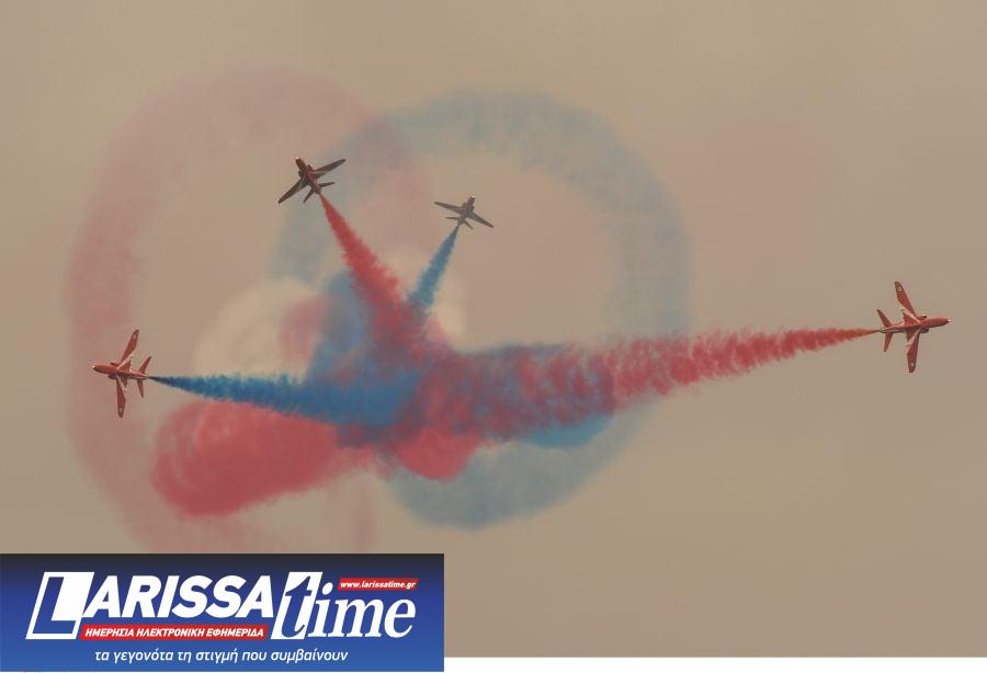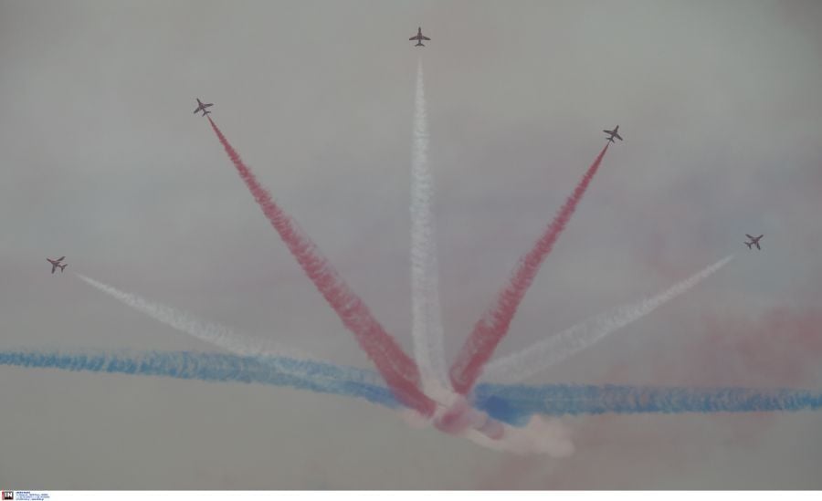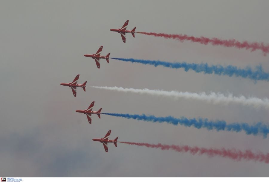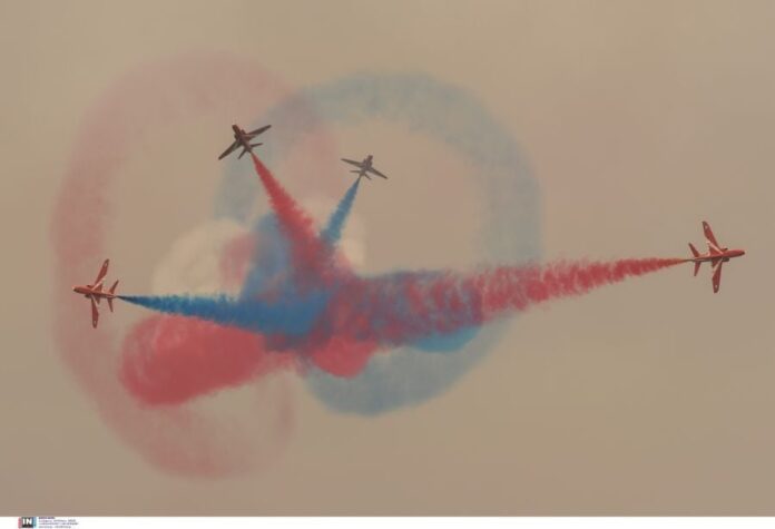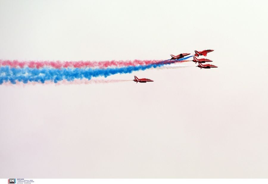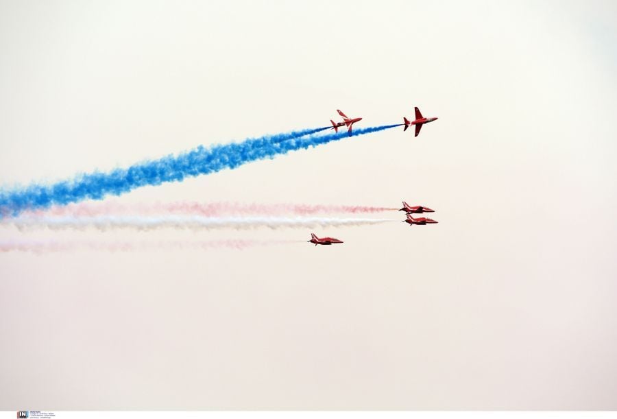 Δύο σμήνη βρετανικών εκπαιδευτικών αεροσκαφών απογειώθηκαν από την Τανάγρα και πραγματοποίησαν μια φαντασμαγορική επίδειξη πάνω από το Δέλτα του Φαλήρου.