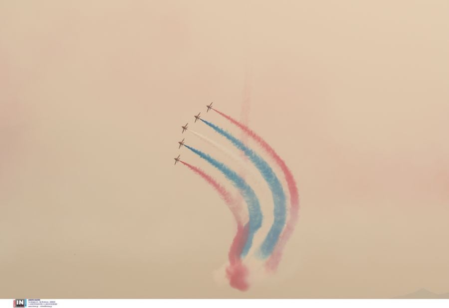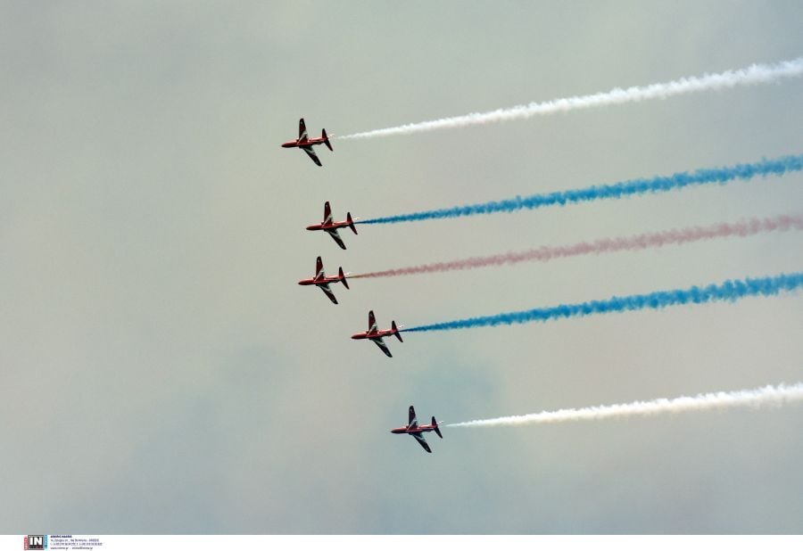 Αεροπορική επίδειξη από τα αεροσκάφη της πτητικής ομάδας «Red Arrows» της Βρετανικής Βασιλικής Αεροπορίας, στο Φλοίσβο Παλαιού Φαλήρου. Παρά την αφρικανική σκόνη στην ατμόσφαιρα το θέαμα εντυπωσίασε.