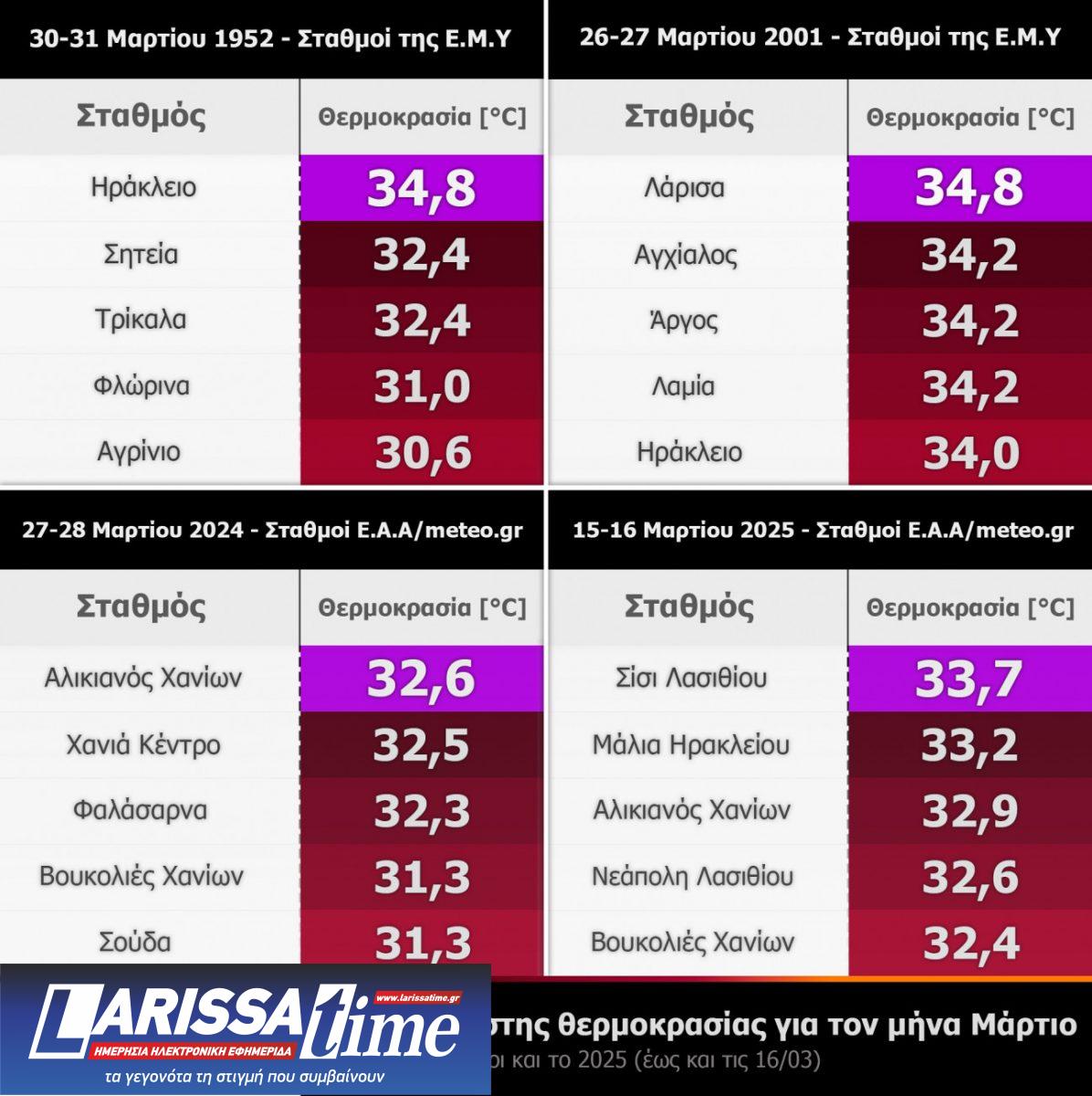 Τέλος, στον παρακάτω πίνακα παρουσιάζονται οι υψηλότερες τιμές θερμοκρασίας που έχουν καταγραφεί από αντίστοιχα γεγονότα υψηλών θερμοκρασιών για τον μήνα Μάρτιο στη χώρα μας από το 1952 έως και το 2025 (μέχρι και τις 16/03) από σταθμούς της Εθνικής Μετεωρολογικής Υπηρεσίας (Ε.Μ.Υ) και του δικτύου αυτόματων μετεωρολογικών σταθμών του meteo.gr / Εθνικού Αστεροσκοπείου Αθηνών.