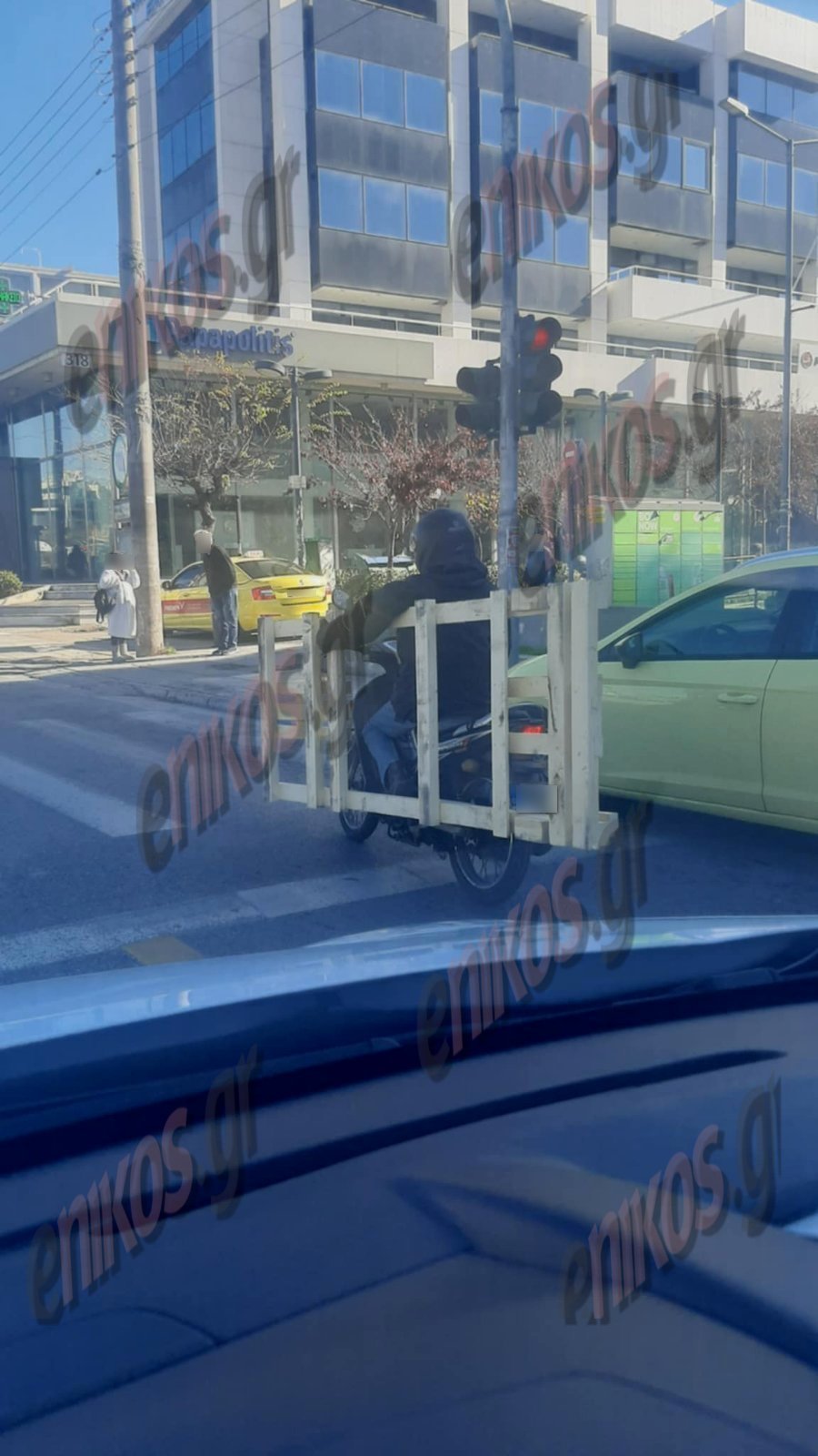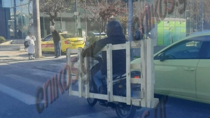 Το περιστατικό συνέβη την Πέμπτη 23 Ιανουαρίου στη λεωφόρο Μεσογείων, στο ύψος του Νομισματοκοπείου, στην Αθήνα. Ο συγκεκριμένος οδηγός, χωρίς να διαθέτει κατάλληλο μέσο για να μεταφέρει μια μεγάλη παλέτα, αποφάσισε να τη σηκώσει με το ένα χέρι, ενώ οδηγούσε το μηχανάκι του με το άλλο.