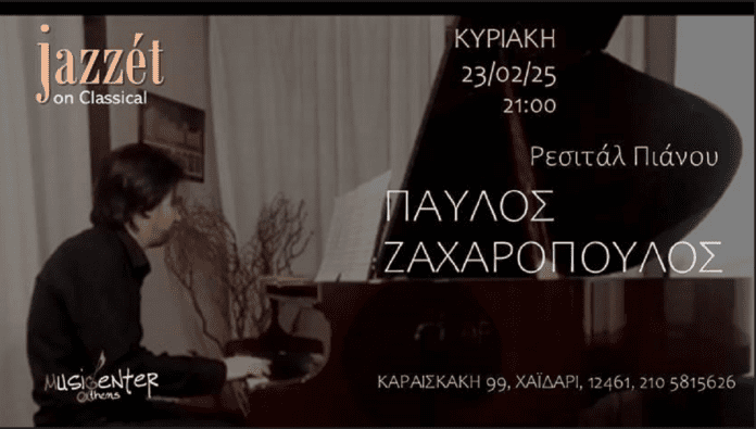 Την Κυριακή 23 Φεβρουαρίου, στις 9 το βράδυ, το Jazzét on Classical υπό την καλλιτεχνική επιμέλεια του Νίκου Χατζηελευθερίου παρουσιάζει το ρεσιτάλ πιάνου του Παύλου Ζαχαρόπουλου.