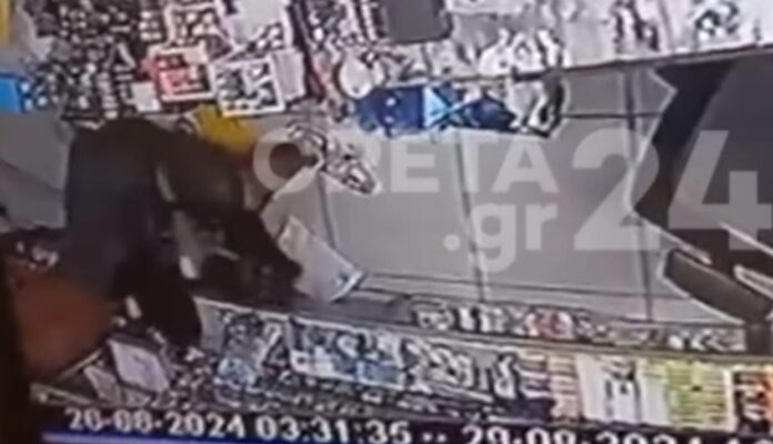 Όπως μπορείτε να δείτε στο του Creta24.gr, ο άνδρας εισβάλλει στο κατάστημα κι αφού αντιλαμβάνεται ότι το ταμείο είναι άδειο, αρπάζει τσιγάρα και ξυστά και φεύγει τρέχοντας όταν χτυπά ο συναγερμός.