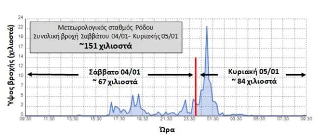 Σημειώνεται ότι μεγάλα ύψη βροχής καταγράφηκαν από το πρωί του Σαββάτου 04/01 και στον σταθμό της Λίνδου, στα ανατολικά του νησιού (65.6 χιλιοστά).