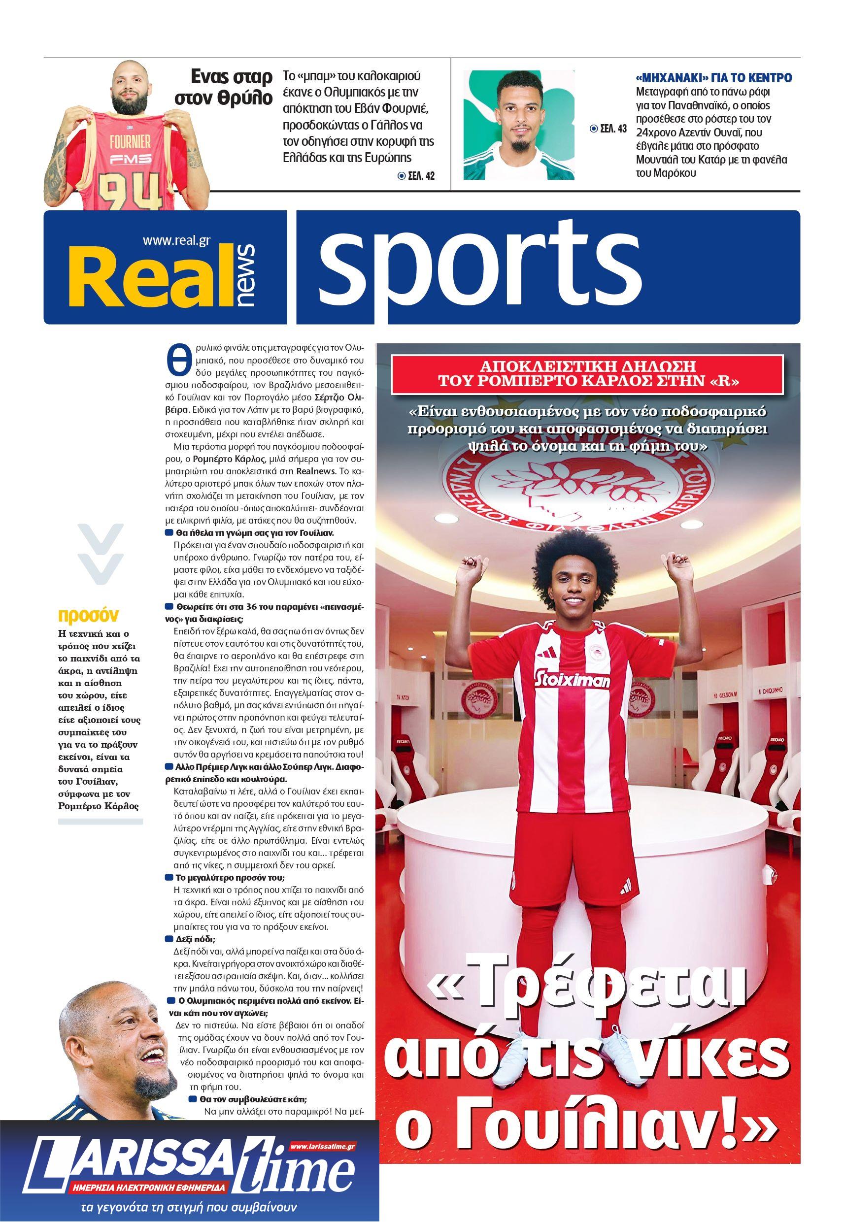 Ειδικά για τον Λατίνο με το βαρύ βιογραφικό, η προσπάθεια που καταβλήθηκε ήταν σκληρή και στοχευμένη, μέχρι που εντέλει απέδωσε. Μια τεράστια μορφή του παγκόσμιου ποδοσφαίρου, ο Ρομπέρτο Κάρλος, μιλά σήμερα για τον συμπατριώτη του αποκλειστικά στη Realnews. Το καλύτερο αριστερό μπακ όλων των εποχών στον πλανήτη σχολιάζει τη μετακίνηση του Γουίλιαν, με τον πατέρα του οποίου -όπως αποκαλύπτει- συνδέονται με ειλικρινή φιλία, με ατάκες που θα συζητηθούν.