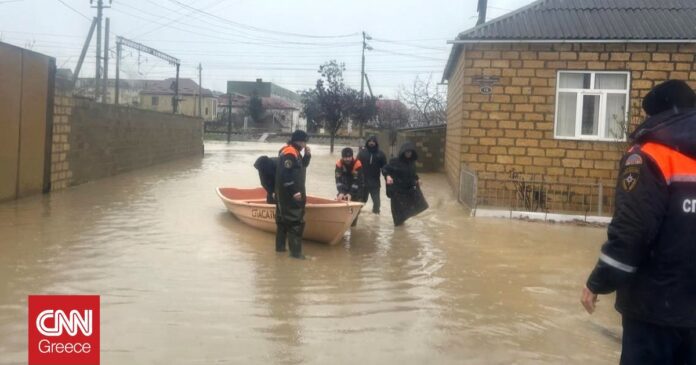 Περίπου 2.000 σπίτια έχουν πλημμυρίσει στην περιφέρεια Ντερμπέντ στην Κασπία. Βρέθηκαν τα πτώματα της γυναίκας και της κόρης της, όμως εξακολουθεί να αγνοείται η τύχη άλλων ανθρώπων.