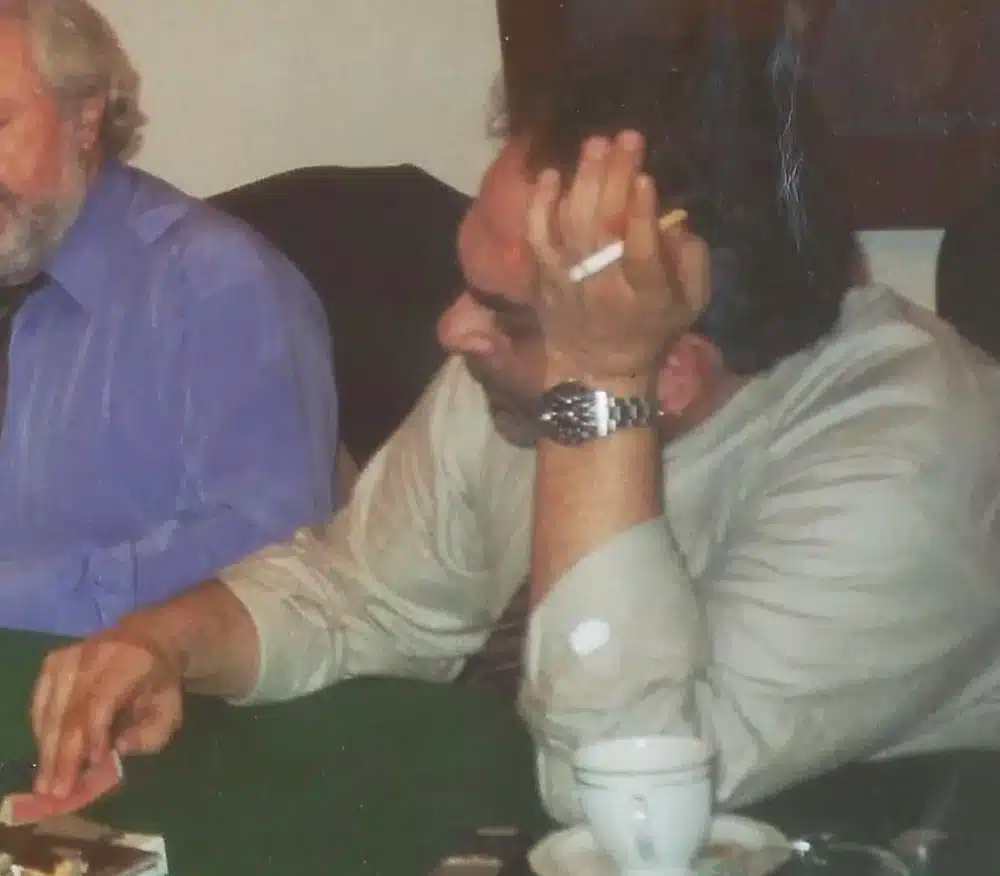 Πάντα με το τσιγάρο στο χέρι και πολλά πακέτα γύρω του μην και ξεμείνει. Ένα μικρό τασάκι το οποίο άδειαζε μόνος του σε ένα μεγαλύτερο για να μη με ταλαιπωρεί. Το πιατάκι με το γλυκό στην άκρη “για ώρα ανάγκης”. Και μία κούπα με καφέ, από τα λίτρα που θα κατανάλωνε μέχρι το ξημέρωμα, πάντα νες “βαπορίσιο”.