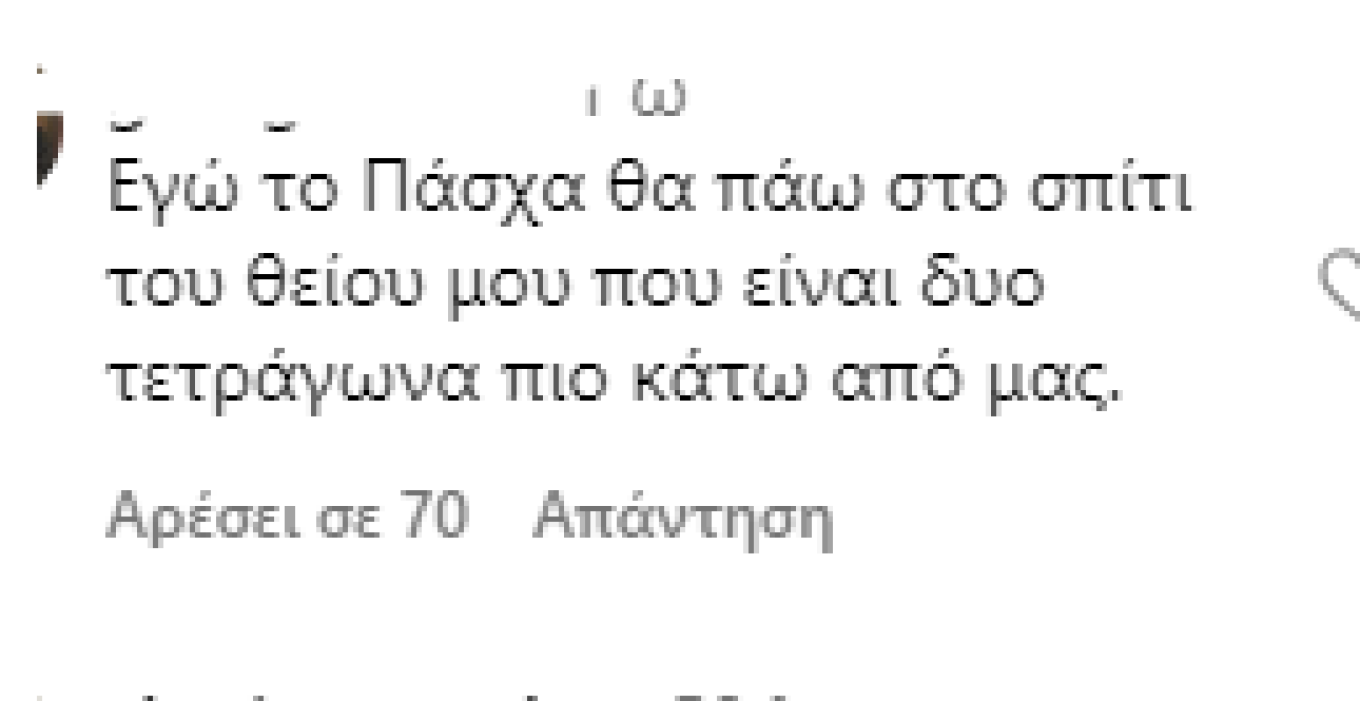 Οι followers άρχισαν να κοροϊδεύουν την Ιωάννα Τούνη, σχετικά με το πού θα πάνε το Πάσχα. Ένας από αυτούς της απάντησε ότι θα πάει μέχρι το σπίτι του θείου του «που είναι 2 τετράγωνα πιο κάτω» και άλλοι της έγραψαν για τα «εξωτικά χωριά τους» με χιουμοριστική διάθεση. «Εγώ που λες συμπεθέρα, θα πάω μέχρι τα Σαγαίικα Αχαΐας» σχολίασε μια ακόλουθος. «Στο εξωτικό Αγρίνιο» έγραψε κάποια άλλη. Κάποιος άλλος της απάντησε με χιουμοριστική διάθεση: «Συμπεθέρα, εγώ θα πάω μέχρι την αυλή που θα ψήνουμε».