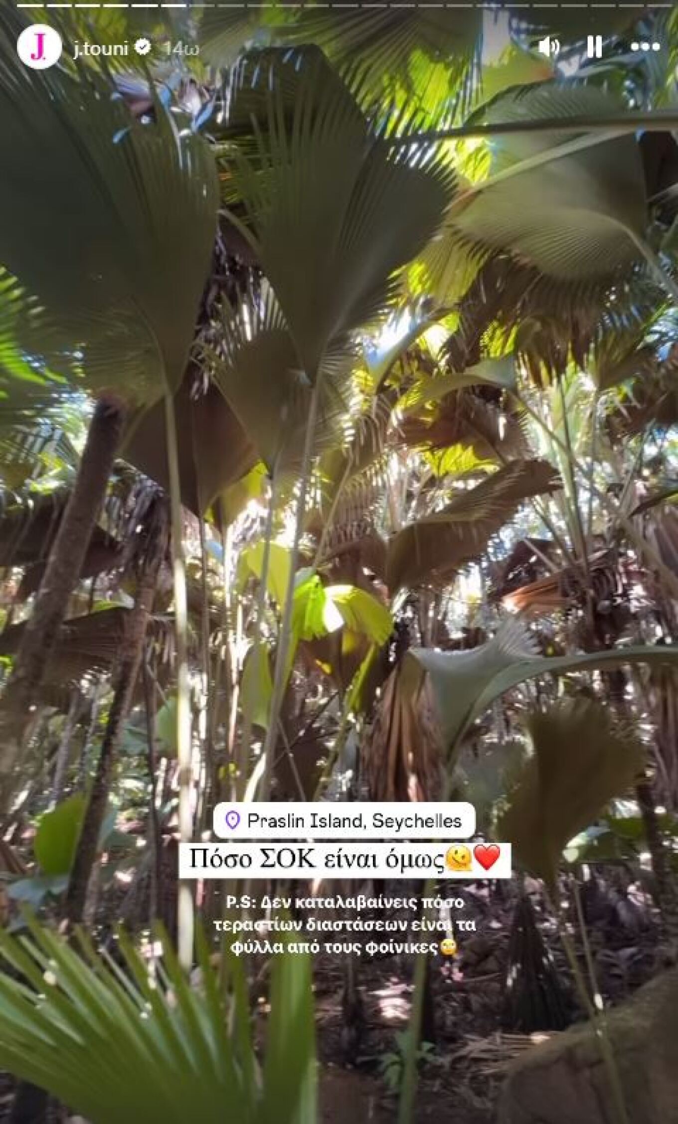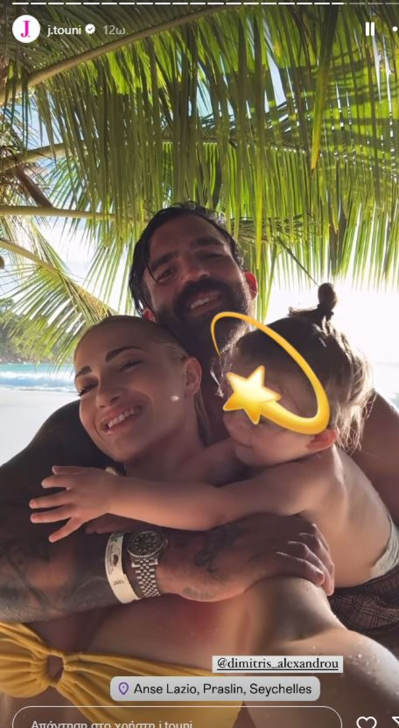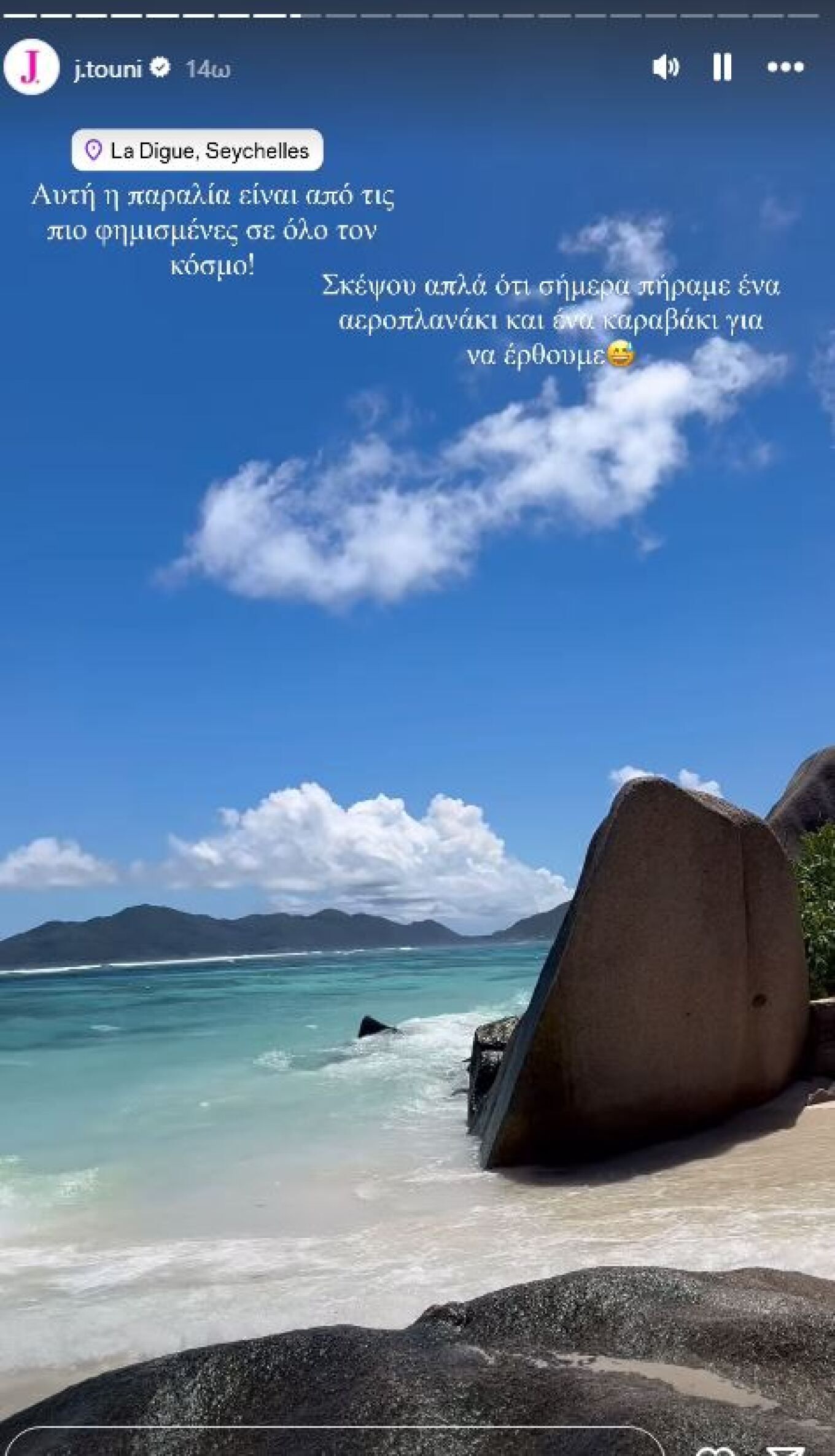 Η Ιωάννα Τούνη συνεχίζει να μοιράζεται στιγμιότυπα από τις διακοπές της στις Σεϋχέλλες μέσω του λογαριασμού της στο Instagram. Μαζί με τον σύντροφό της, Δημήτρη Αλεξάνδρου, και τον γιο τους, Πάρη, απολαμβάνουν τις εξωτικές παραλίες και μοιράζονται τις εντυπώσεις τους με τους ακόλουθους τους.