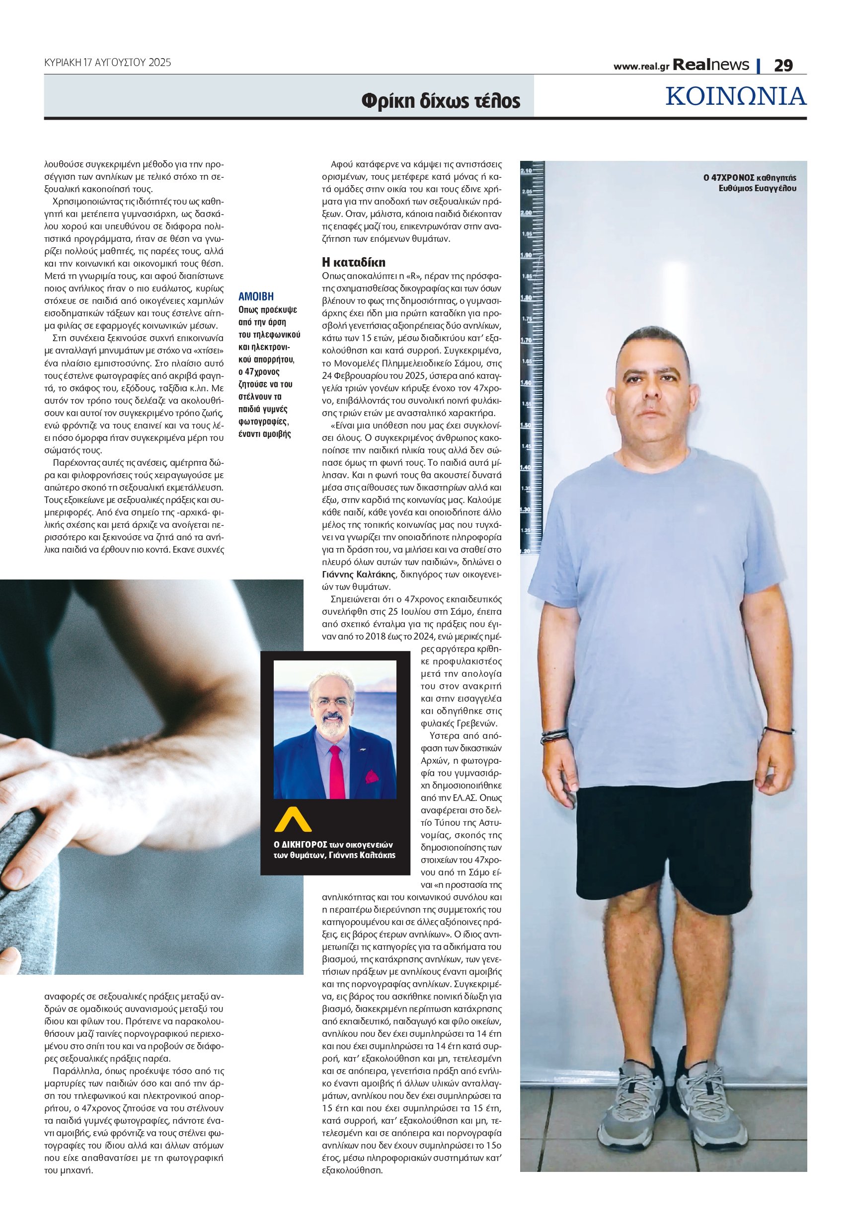 «Είναι μια υπόθεση που μας έχει συγκλονίσει όλους. Ο συγκεκριμένος άνθρωπος κακοποίησε την παιδική ηλικία τους αλλά δεν σώπασε όμως τη φωνή τους. Το παιδιά αυτά μίλησαν. Και η φωνή τους θα ακουστεί δυνατά μέσα στις αίθουσες των δικαστηρίων αλλά και έξω, στην καρδιά της κοινωνίας μας. Καλούμε κάθε παιδί, κάθε γονέα και οποιοδήποτε άλλο μέλος της τοπικής κοινωνίας μας που τυγχάνει να γνωρίζει την οποιαδήποτε πληροφορία για τη δράση του, να μιλήσει και να σταθεί στο πλευρό όλων αυτών των παιδιών», δηλώνει ο Γιάννης Καλτάκης, δικηγόρος των οικογενειών των θυμάτων.