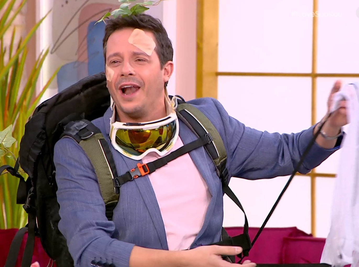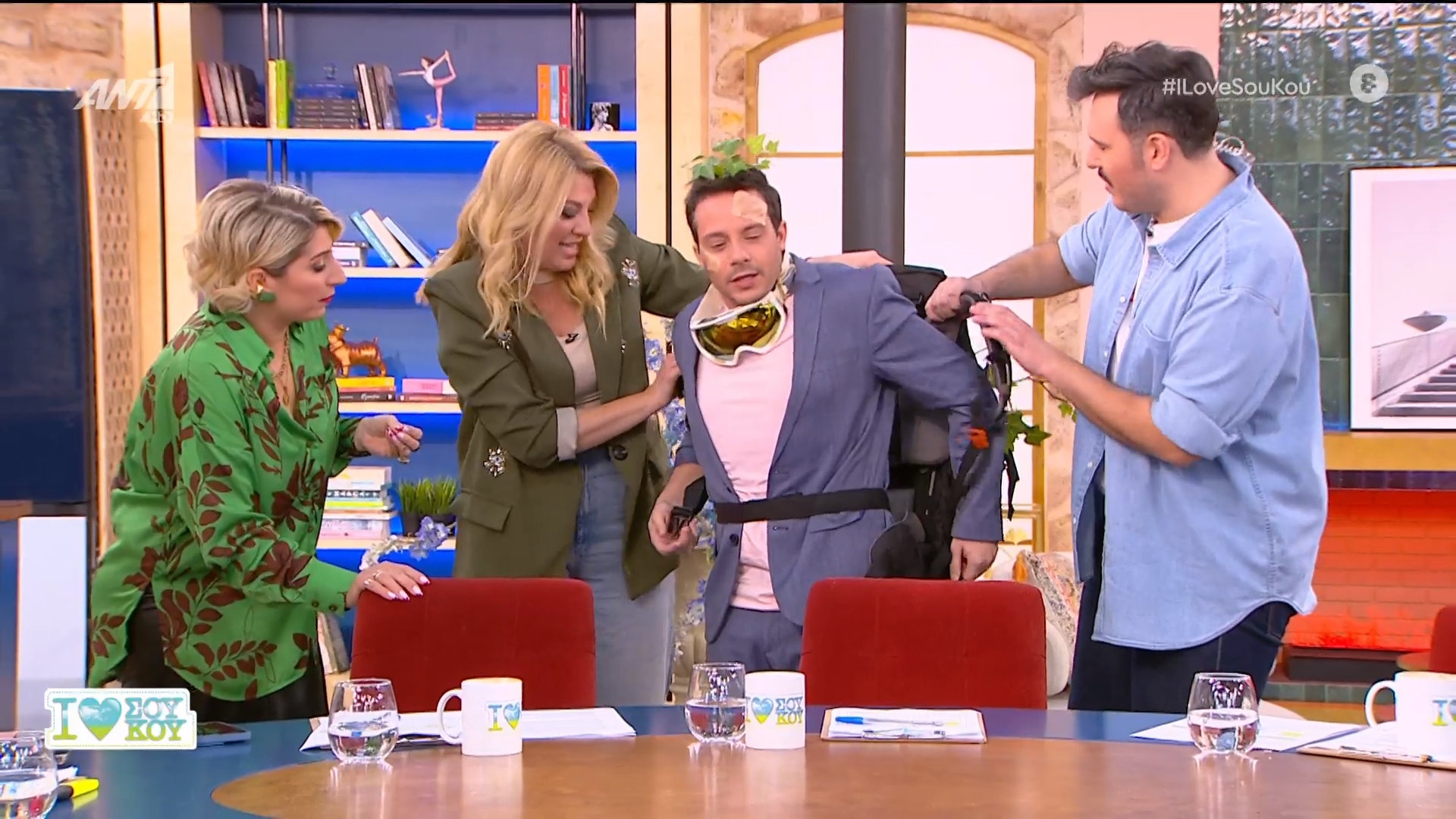 Πως; Μα με το να εμφανιστεί ντυμένος «αλεξιπτωτιστής» λίγο αργότερα στην εκπομπή και «μπαταρισμένος» από κάποια πτώση.