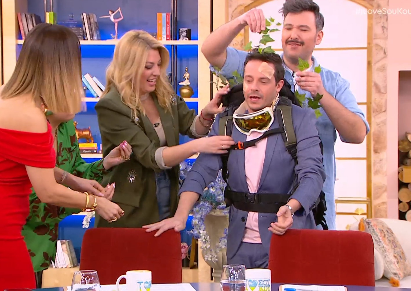 Πως; Μα με το να εμφανιστεί ντυμένος «αλεξιπτωτιστής» λίγο αργότερα στην εκπομπή και «μπαταρισμένος» από κάποια πτώση.