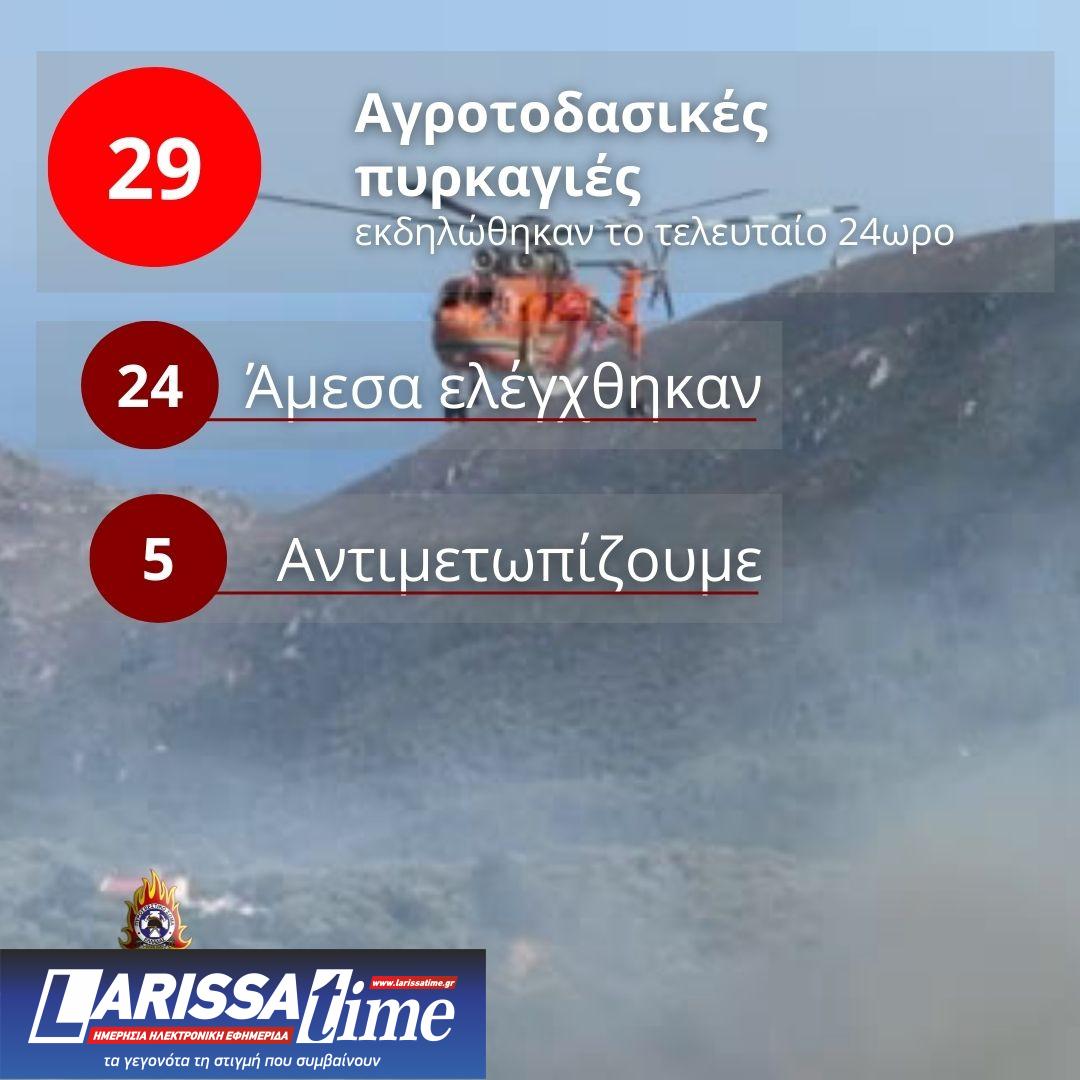 Είκοσι εννέα αγροτοδασικές πυρκαγιές εκδηλώθηκαν το τελευταίο 24ωρο στην Ελλάδα (έως τις 18:00), σύμφωνα με τη σχετική ενημέρωση της πυροσβεστικής υπηρεσίας.