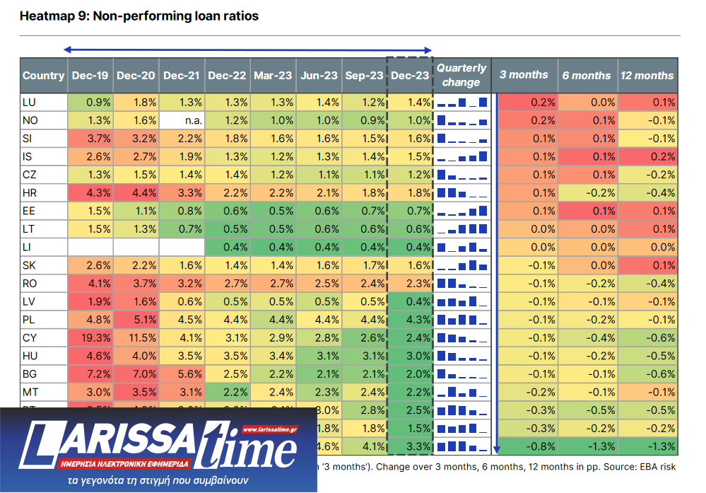 Η κατάσταση διαφέρει μεταξύ των χωρών. Η Γερμανία (+4 δισ. ευρώ) και η Αυστρία (+1,8 δισ. ευρώ) είχαν τις μεγαλύτερες αυξήσεις ΜΕΔ το 4ο τρίμηνο του 2023, ακόμη και αν η επιδείνωση συγκρατήθηκε και οι δείκτες ΜΕΔ αντιστράφηκαν μόνο στα επίπεδά τους του Δεκεμβρίου 2019. Αυτό έρχεται σε αντίθεση με τις συνεχιζόμενες βελτιώσεις στην Ολλανδία (-1,2 δισ. ευρώ) και στην Ιταλία (-1,7 δισ. ευρώ).