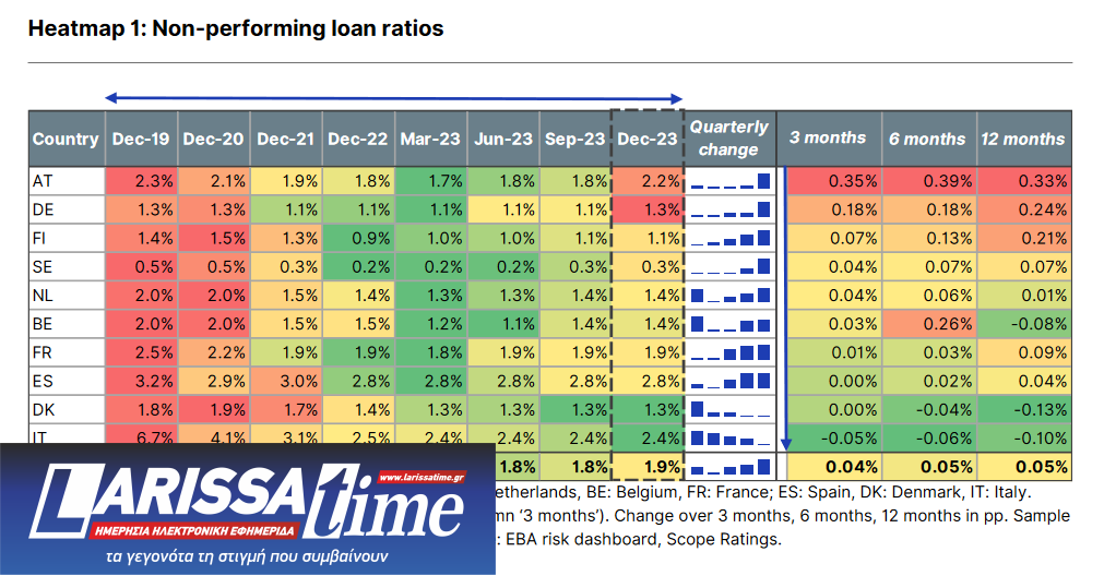 Αν και η αύξηση ήταν μέτρια, ωστόσο εξακολουθεί να αντιπροσωπεύει μια αντιστροφή της μακροπρόθεσμης τάσης βελτίωσης της ποιότητας των περιουσιακών στοιχείων, αναφέρει ο Scope. Και παρόλο που προβλέπει μια μέτρια οικονομική ανάκαμψη το δεύτερο εξάμηνο του 2024, υποβοηθούμενη από τις πιθανές μειώσεις επιτοκίων, ο σχηματισμός ΜΕΔ πιθανότατα θα συνεχίσει να αυξάνεται μέτρια φέτος λόγω μιας χρονικής υστέρησης, εξηγεί.